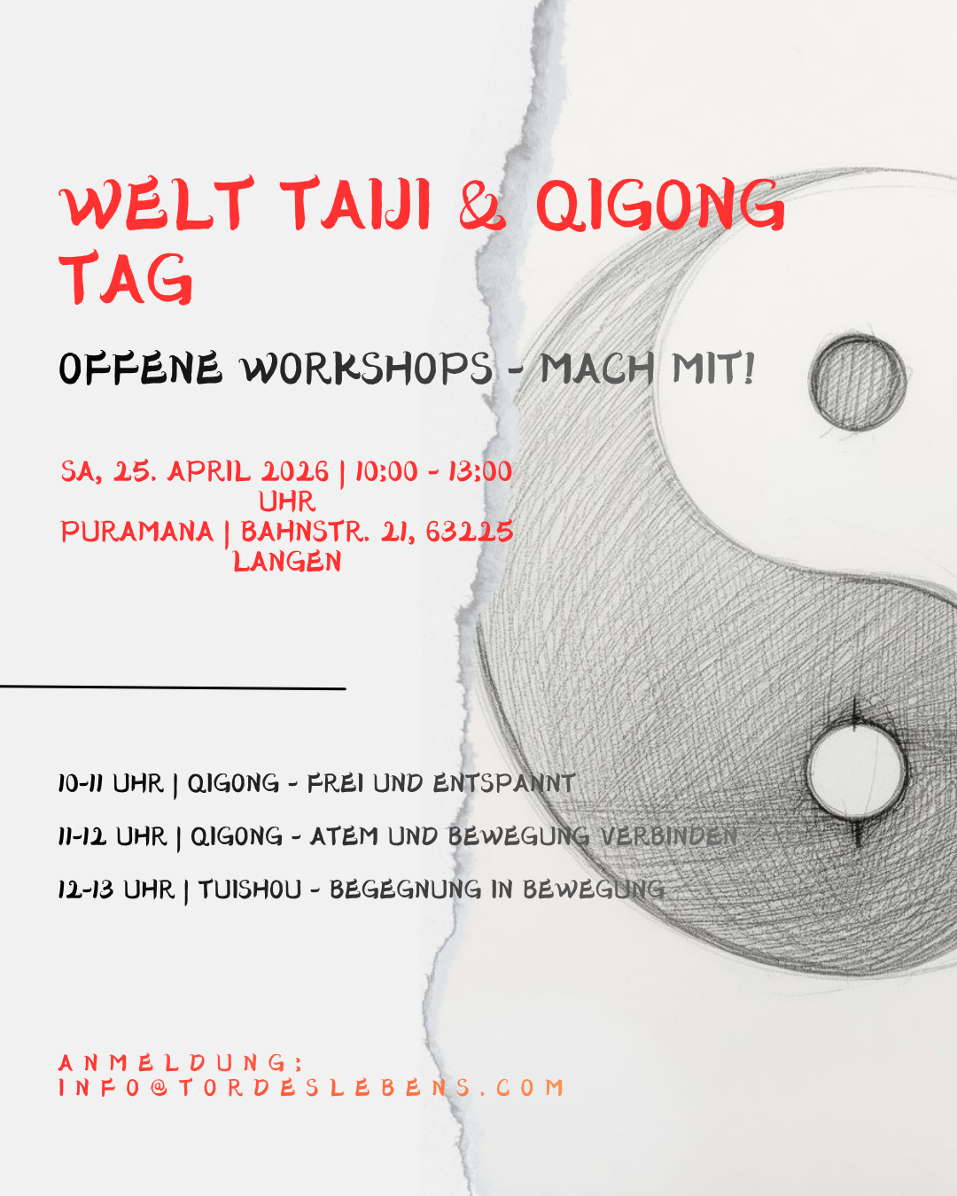 Anlässlich des World Tai Chi and Qigong Day lade ich herzlich zu unseren offenen Workshops ein.